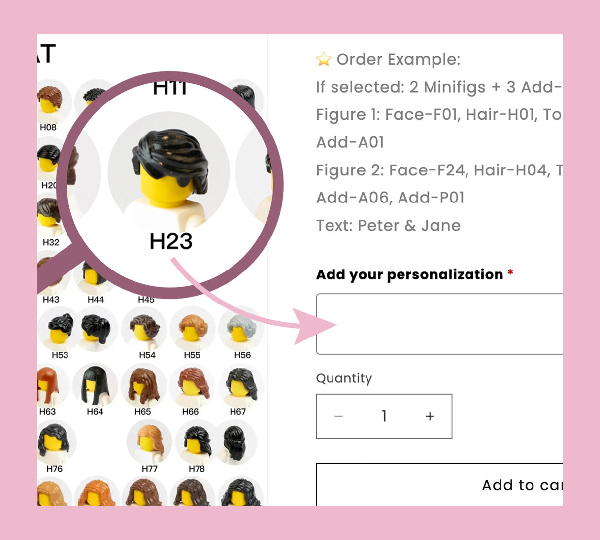Browse the photos, pick your favorite parts, and write the item codes plus your text or name in the personalization box.